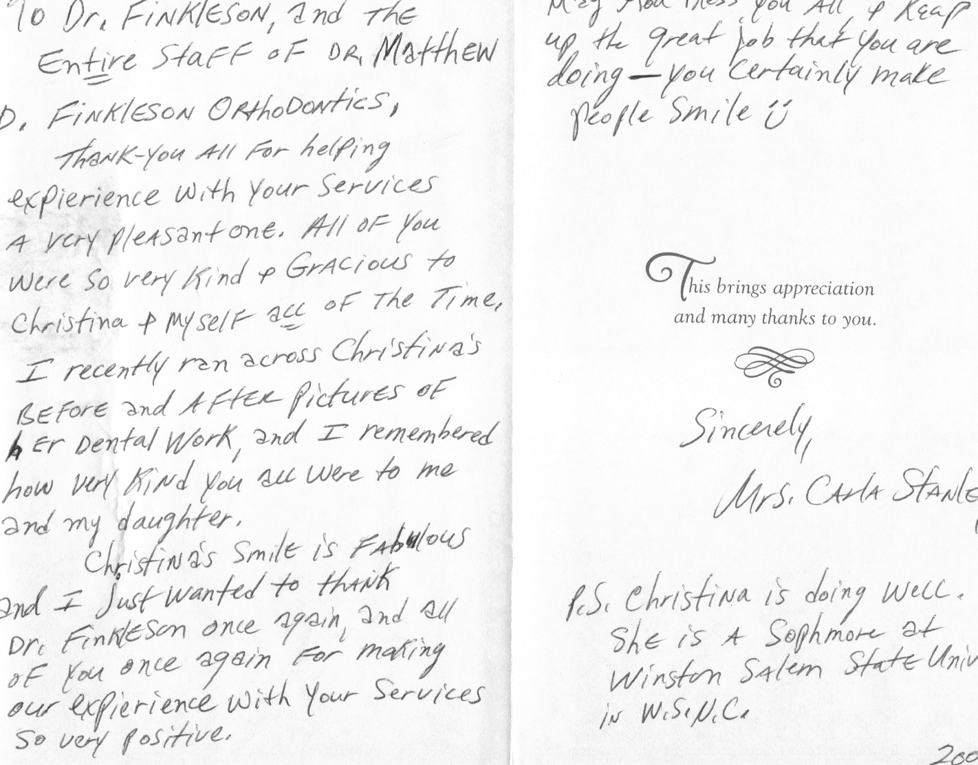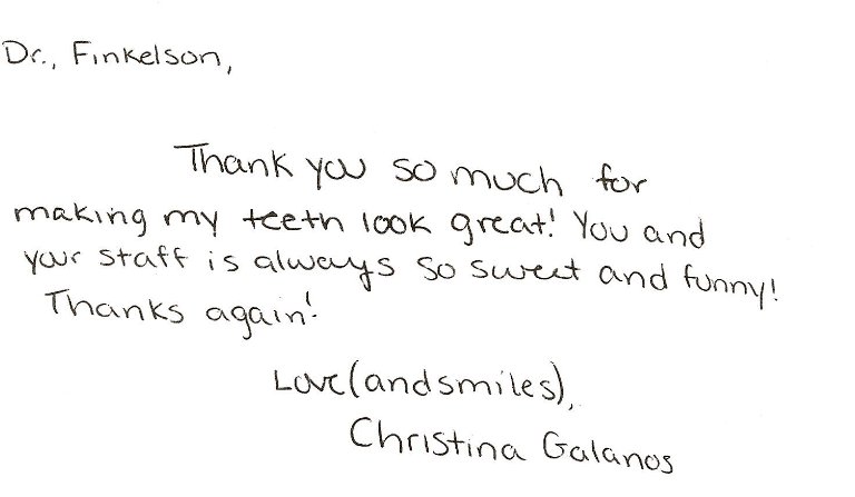 "I was in your office yesterday, and I loved it! Miss. Brown and Dr. Finkelson are hilarious! You guys made me feel like I was special and like we'd known each other for years. I can't wait to get my brackets on Tuesday! Thanks again! "