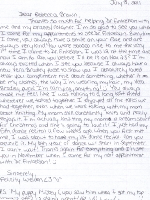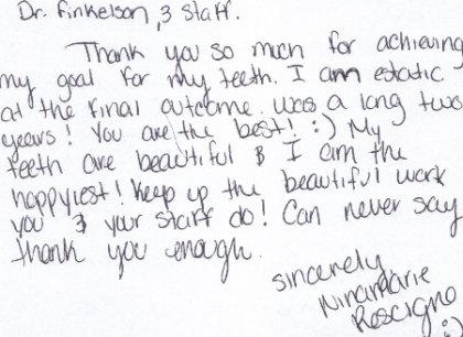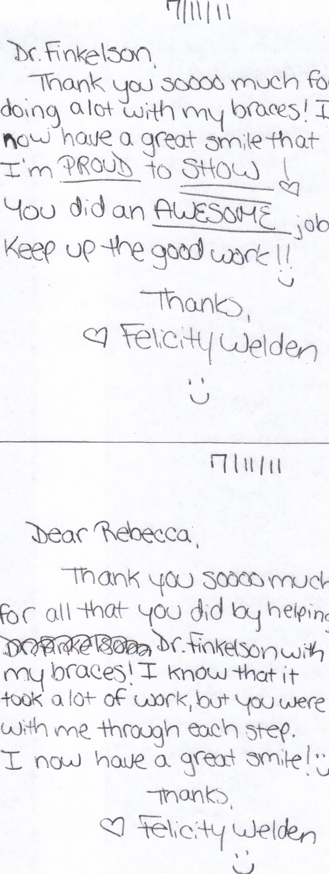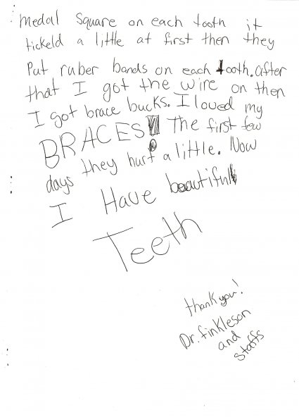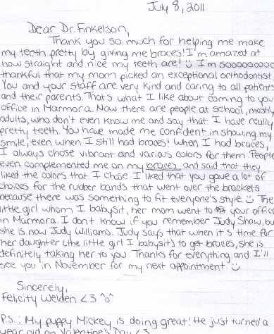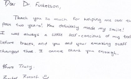I've had my braces off for about 5 years and everyone still remembers my name. Now that i've passed the awkward years with braces and pimples, I would do it all over again to have regular check ups at the office. thanks for all the ladies and Dr. Finkelson for making my smile beautiful :