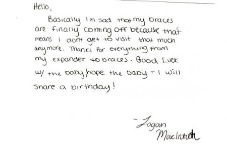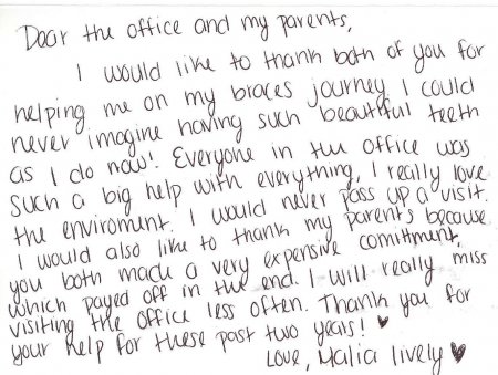 We have been coming to you for 13 years. I will be sad to leave. All 3 of my kids are done :( but the smiles they have are beautiful. Thank goodness for retainers, this way we can still come and see you sometimes.Going to you was never an augh moment for my kids, meaning augh we have to go to the dentist. They loved coming to see you and they especially loved to tell you about the things they do, hockey, dance, singing while riding a bike with eyes closed etc. Jessica even told on herself when she ate candy and would break things (every month)you never made them feel bad.WE LOVE YOU GUYS!