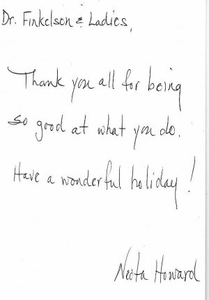After reviewing our answers for the attached questionaire we noticed that all our answers were the same, "Exceeded our expectations!" We have been coming to Dr. Finkelson's office for over 5 years and even though we know how great you all are....it never ceases to amaze us how friendly, knowledgible and just plain AWESOME you all are! We appreciate every bit of time that you spend with us, we always feel appreciated and respected and cared for when we leave your office! You all are exceptional!