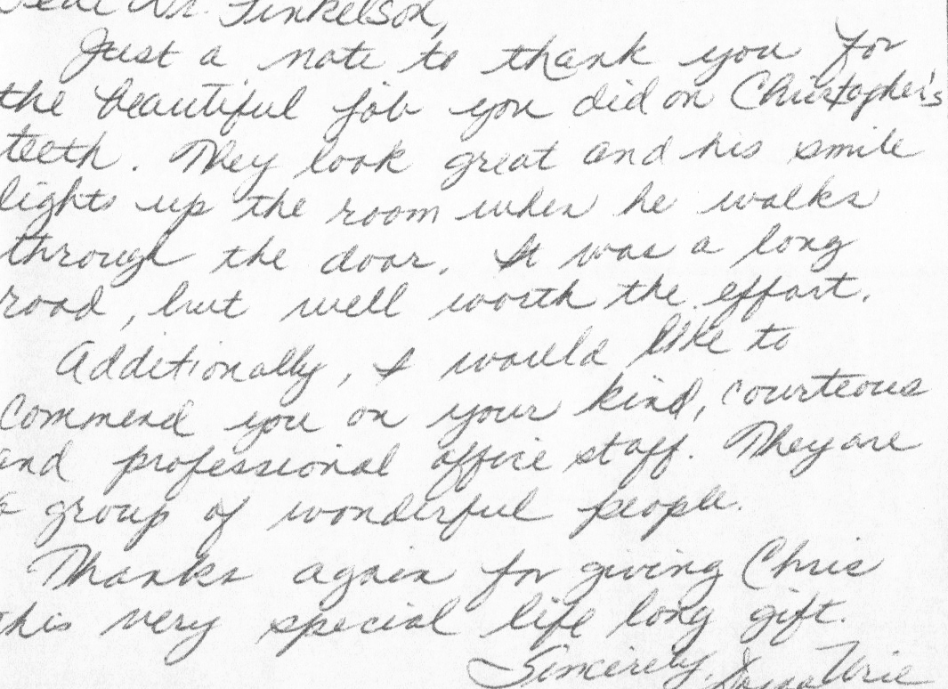 Our experience at your office has been a positive one since the very first day. Your staff is friendly and professional. I've never been to an such a happy office. My son now has a great smile thanks to you, Dr. Finkelson. Thank you so much.