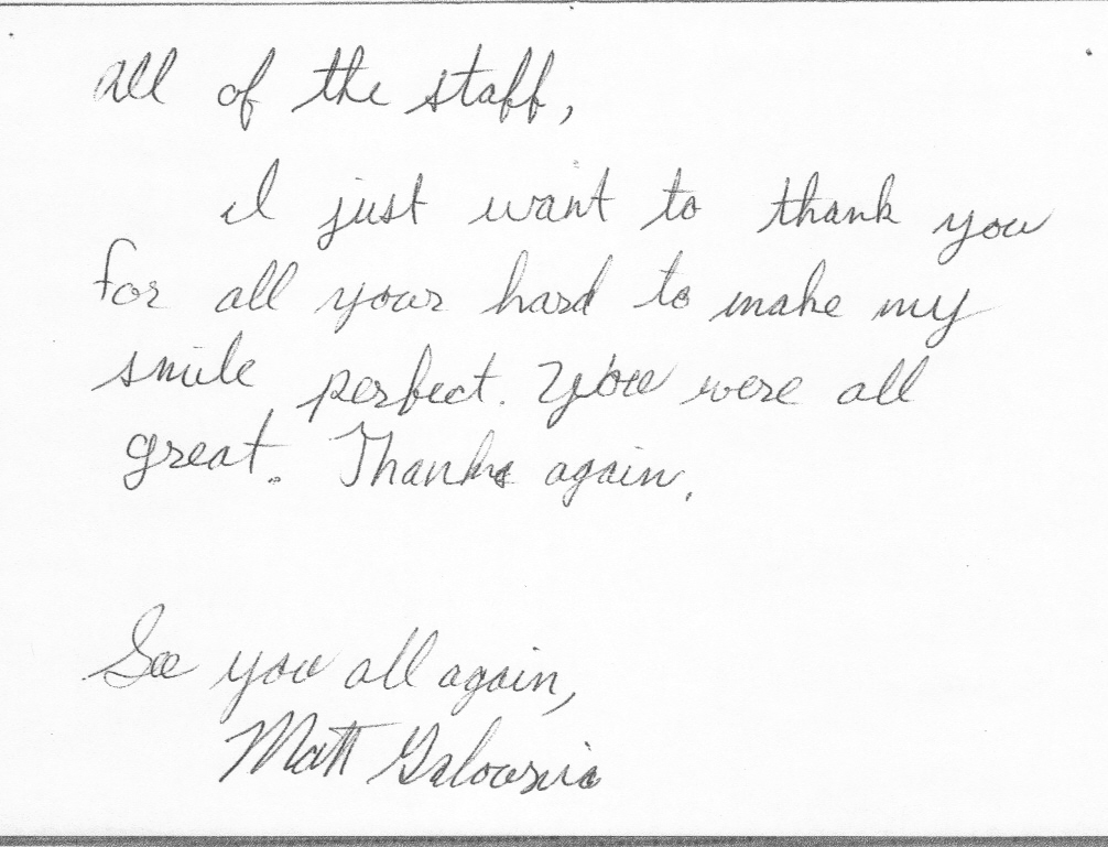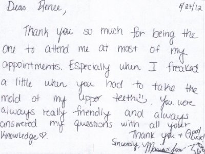 You make me smile, many times over. I smile when I think about the sincere and personal care I receive during every appointment. I smile when I wait in other doctors' offices, knowing that I don't wait in your office and that it is truly possible to be efficient, effective and professional! I smile when I read your congratulatory messages and note-worthy information throughout your waiting room and in your email newsletters. Walking in your office, I smile with every greeting to match the smile I am given. And I smile when I look at my "straight" teeth and know that you won't quit until they look perfect! Your wonderful standard of perfect!