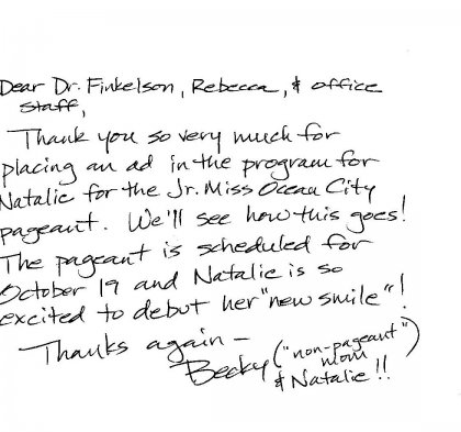 From their friendly greetings on the phone ("How can I make you smile today?")to their well run office -- they always fit us in and we NEVER wait when we arrive for our apointments -- Dr. Finkelson's office is just tops. Dr. Finkelson is so accessible, even coming out into the reception area to sit down and talk to patients and their families. The overall experience is exceptional. Donna & Jim Ziereis (2 children in Dr. Finkelson's care)